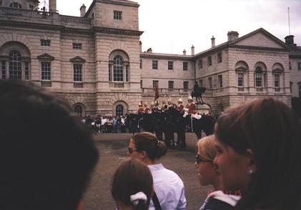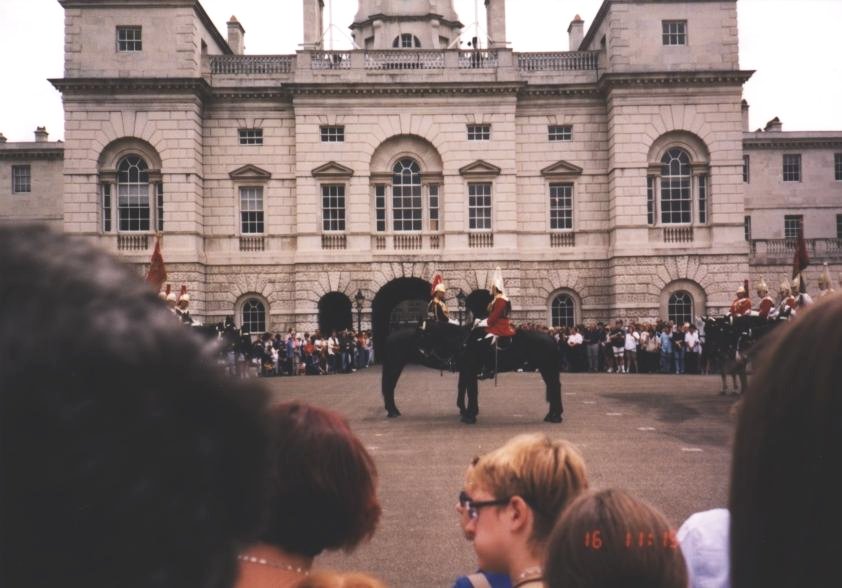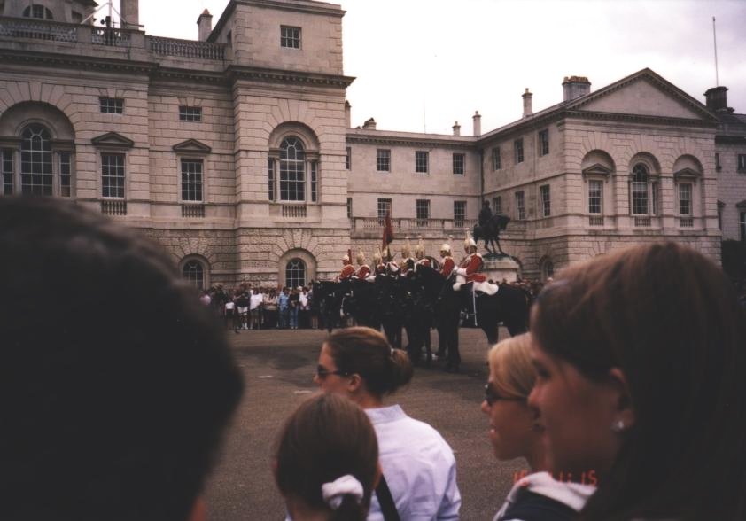 Royal British guards hanging out on their horses acting very British and guard-like.