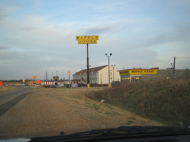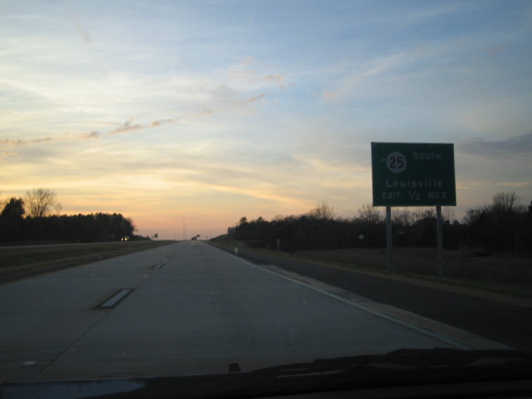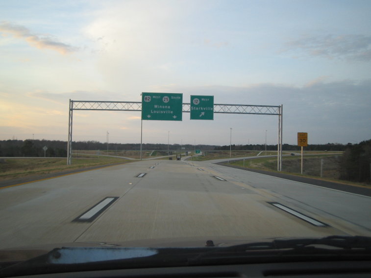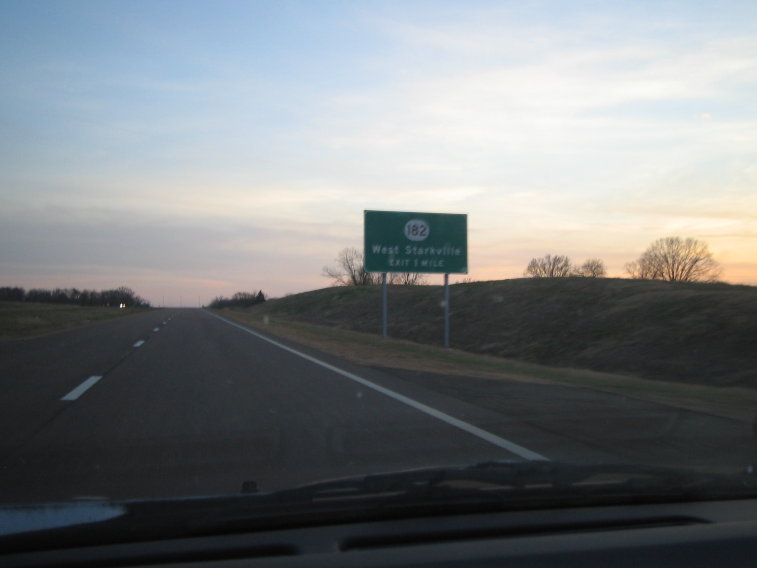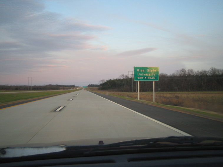 I drove further on Highway 82 before turning around to backtrack to Highway 25. Here's a shocking sign: "Starkville NEXT 3 EXITS". I guess Starkville isn't a small town anymore! |