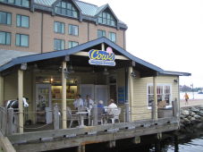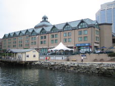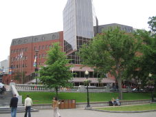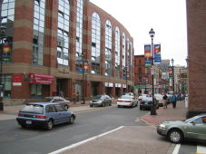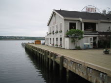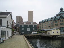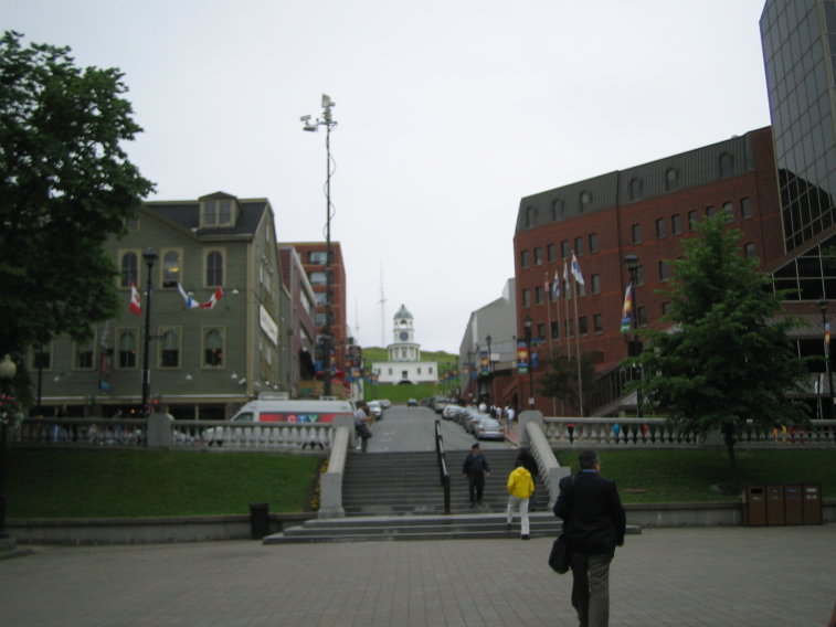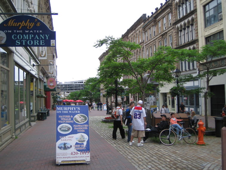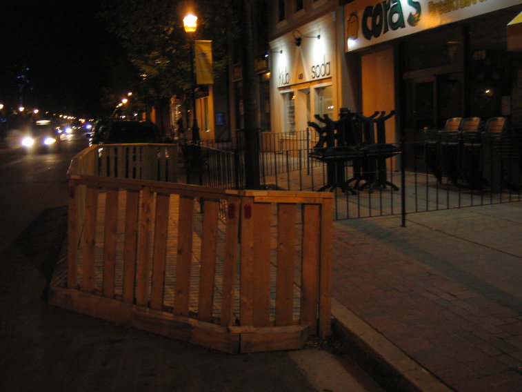 It looks like during the summer, many restaurants in downtown Fredericton set up outdoor seating that occupies the entire sidewalk. Pedestrian travel is accomodated by setting up a temporary wooden walk-around in the parking lane. I thought this was a pretty clever way of trading off parking for outdoor seating during the warmer summer months when outdoor seating is probably valued higher than a close parking spot. |