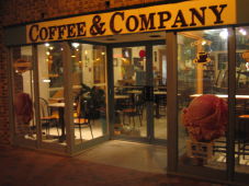 Notice the giant ice cream cones in this coffee shop's storefront. |
